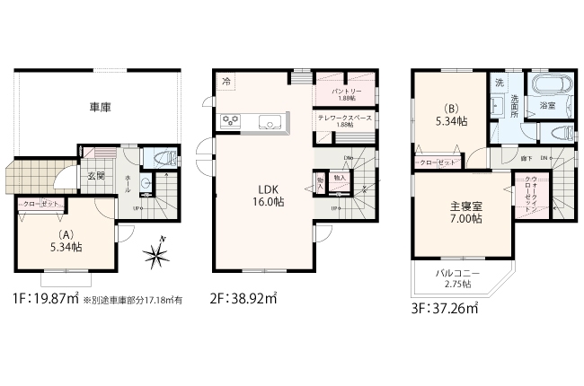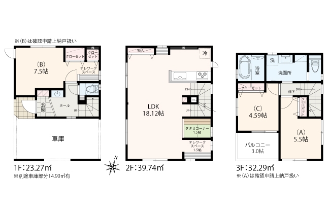 2号棟:95.30㎡(28.82坪)※別途車庫部分14.90㎡有